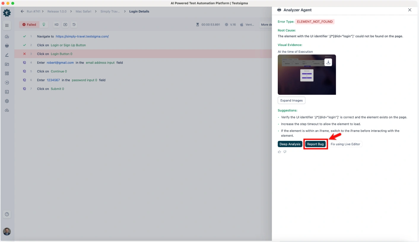 1. The Bug Reporter Agent kicks in on failure. It captures screenshots, logs, and reproduction steps automatically.