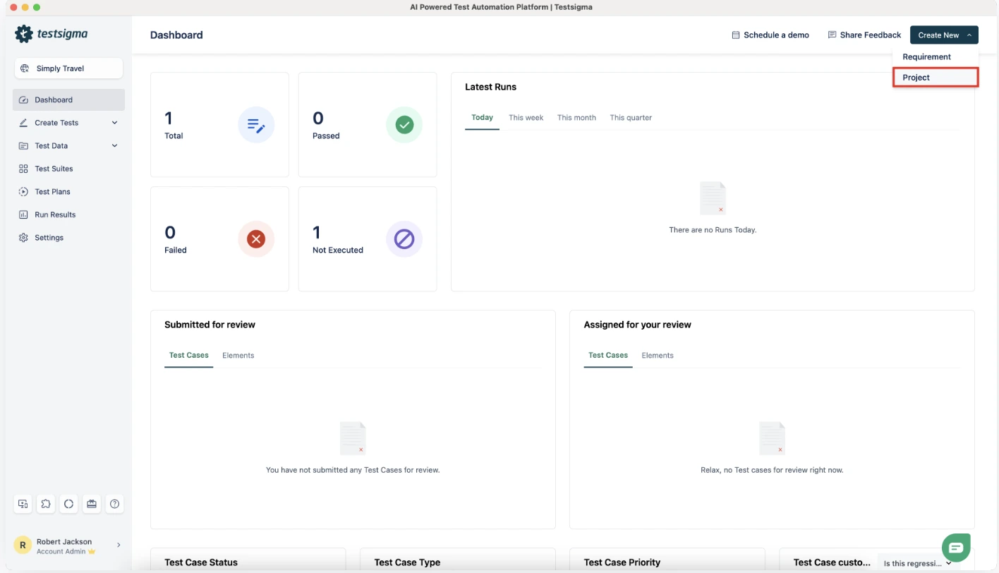 Log in to Testsigma. Navigate to Create > New Project. Select Android or iOS as your platform. Upload your Flutter APK or IPA file via Test Data > Upload.