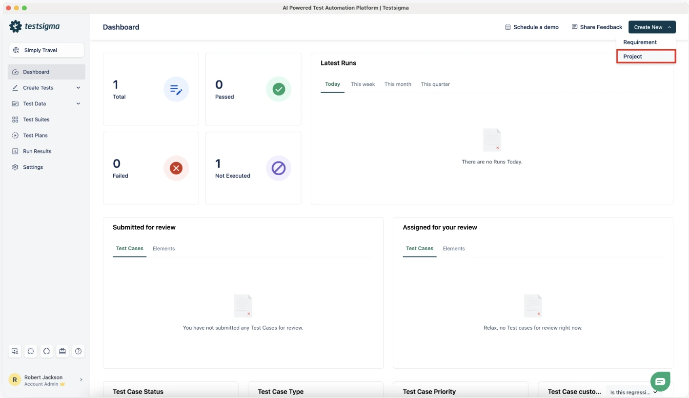Sign up at testsigma.com. Create a new project for your web application. No local installation required, Testsigma runs entirely in the cloud.