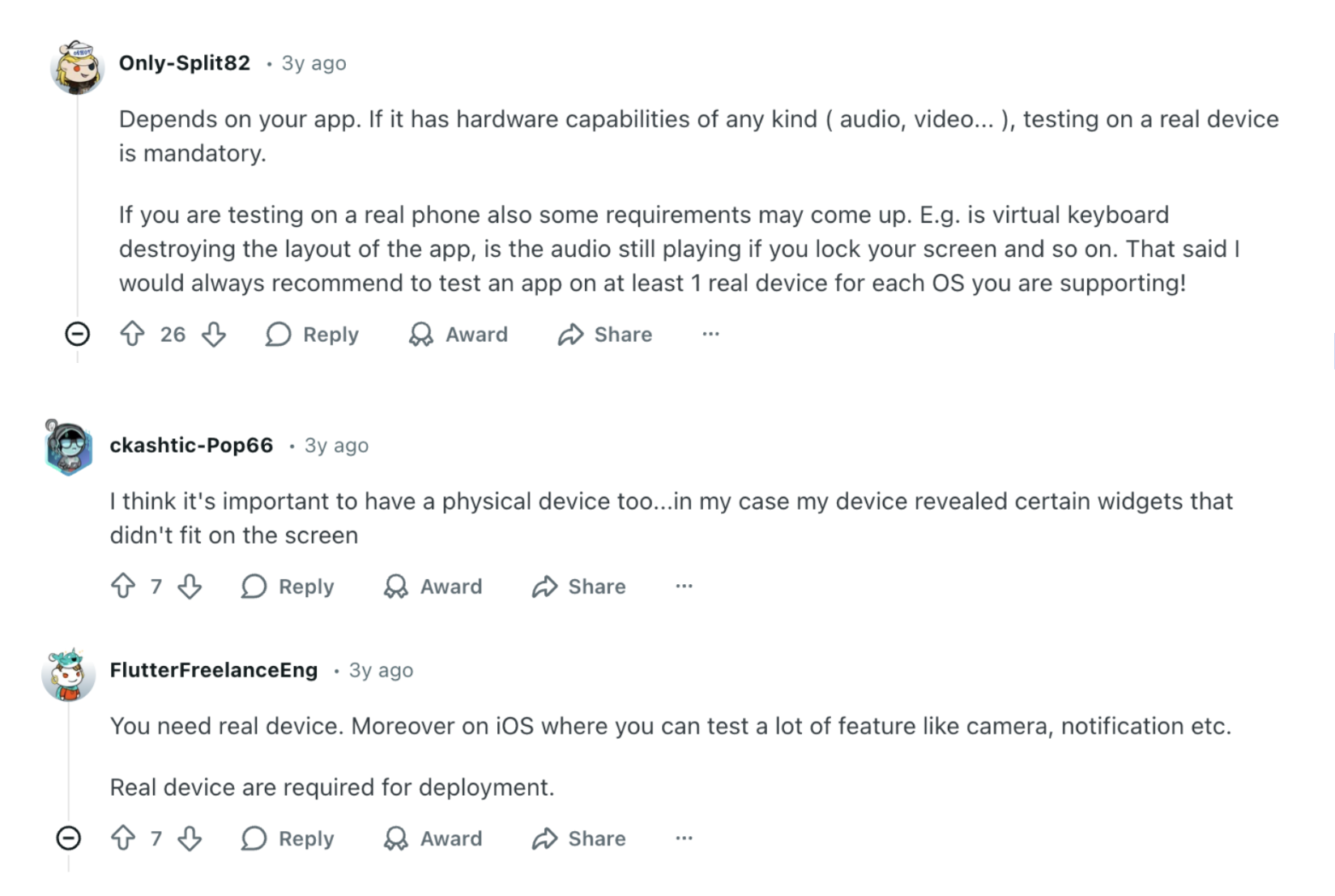 Many testers note that emulators can miss important edge-case bugs that only appear on actual devices, such as layout shifts, performance glitches, and responsiveness issues under real usage. One QA pro on Reddit said: “… those 5% bugs which we miss on emulators are the worst ones which come up directly on client devices.”