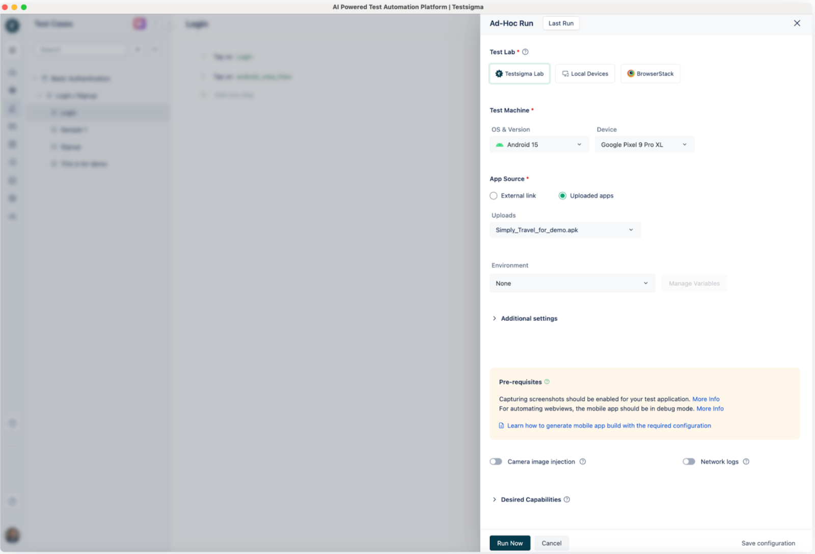 - Select Testsigma Lab from test lab options to run tests on real devices in the cloud that you don’t need to own or maintain