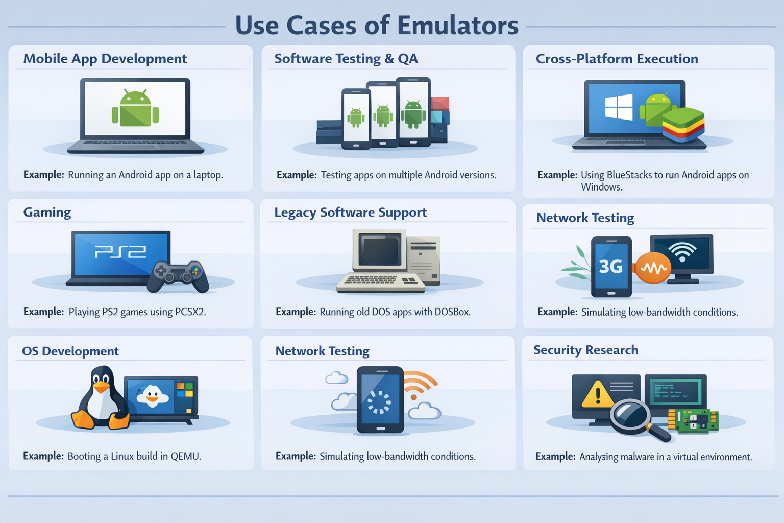Example: Running an Android app on a laptop using an Android Emulator. - Software Testing & QA: Helps teams test applications across multiple OS versions, screen sizes, and device configurations.