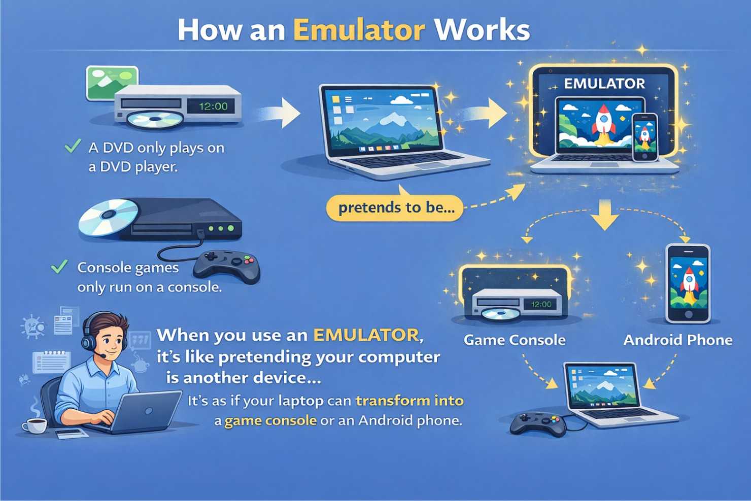 - An emulator makes your computer behave like another device (such as an Android phone or a game console), so software built for that device can run.