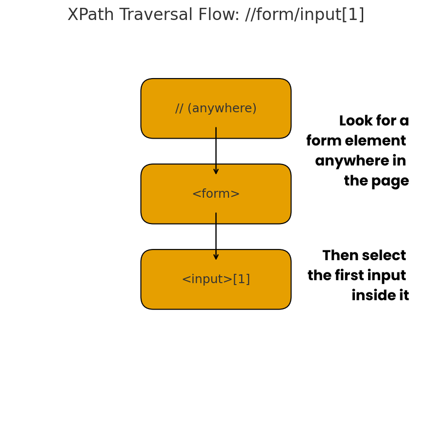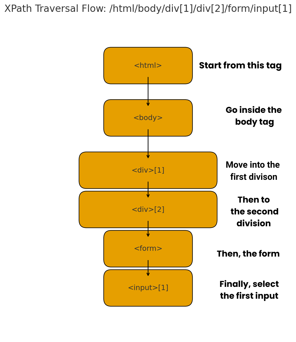 XPath (short for XML Path Language) is a way to point to specific elements on a webpage or XML document. Imagine the webpage as a tree of elements: XPath gives you a precise address to reach any node (like an input box, button, or link).