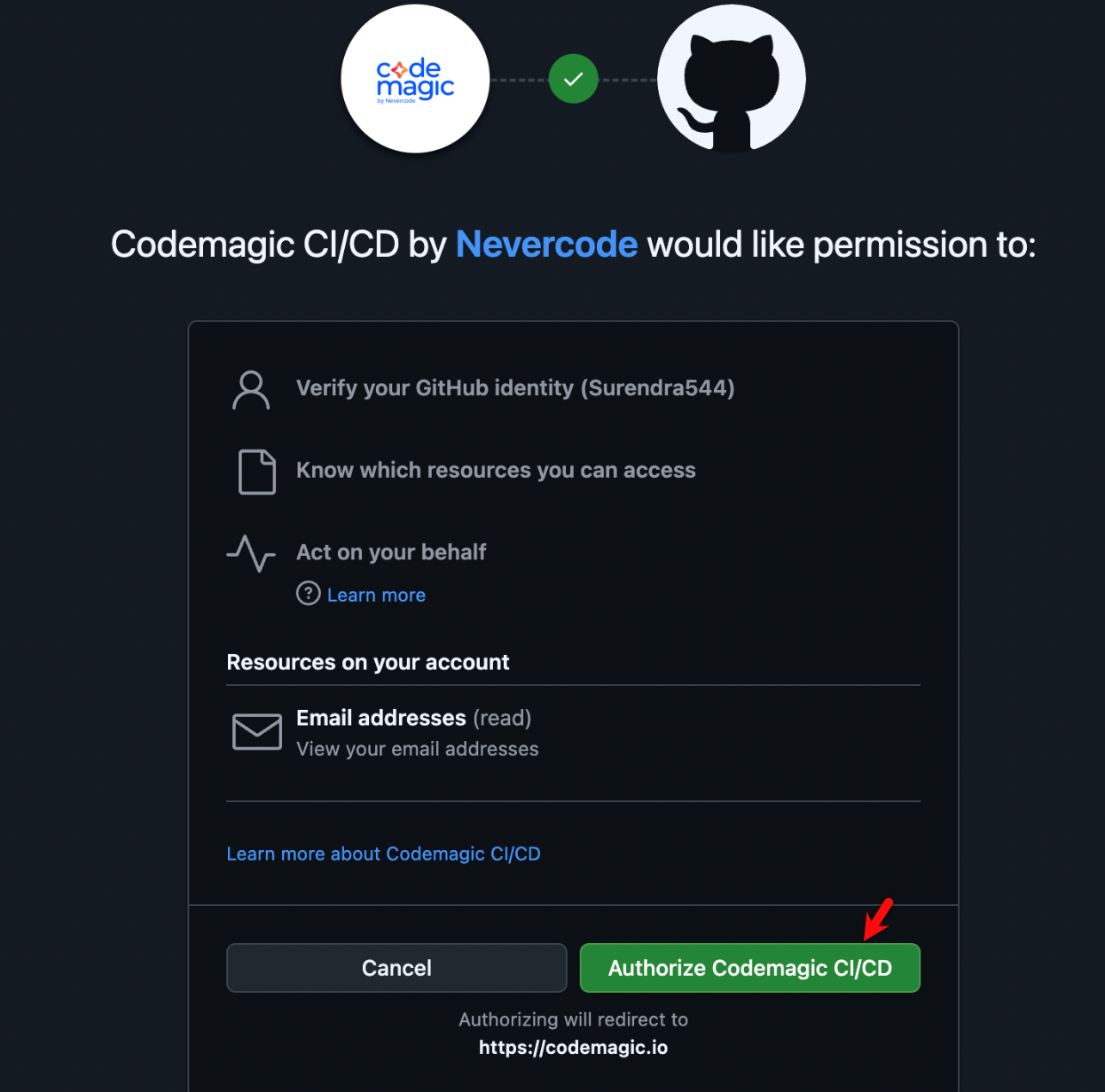 - After signing in, authorize Codemagic by clicking Authorize Codemagic CI/CD.