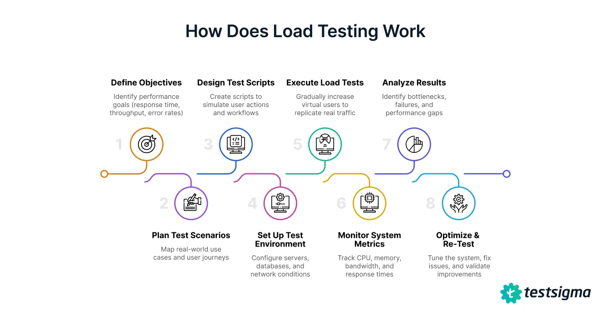 Load testing simulates real-world user traffic to check how it works under various conditions. The load testing environment stipulates varying network and battery levels, task scheduling, and traffic maintenance. It also generates virtual users that mimic real user actions such as browsing, logging in, or purchasing. The test gradually increases the load from a normal user count to peak traffic to identify how the system responds regarding speed, stability, and scalability.