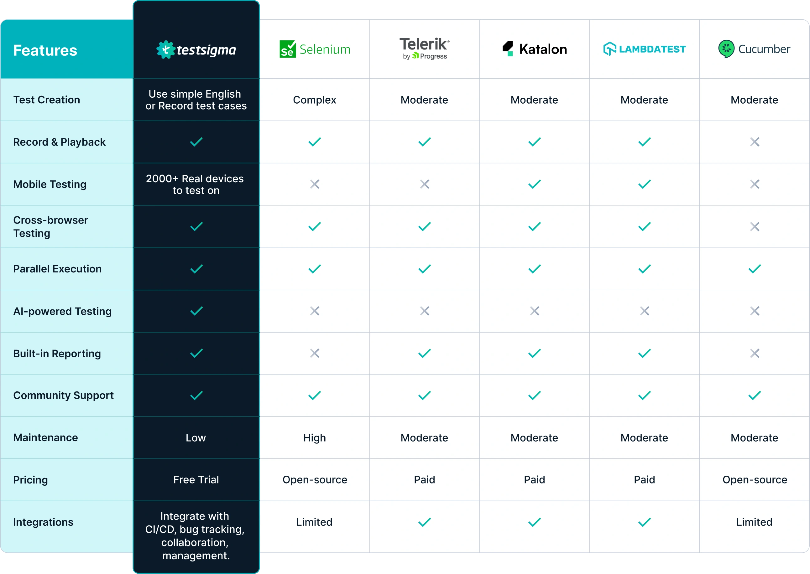 Testsigma checks all these boxes, from AI-powered self-healing to CI/CD-ready integrations. Start testing smarter today with your free trial.